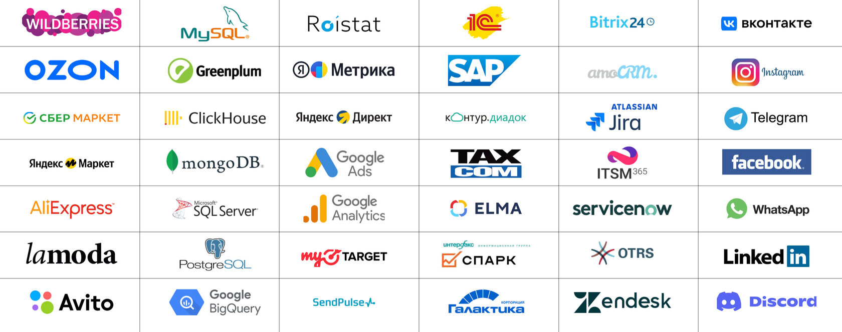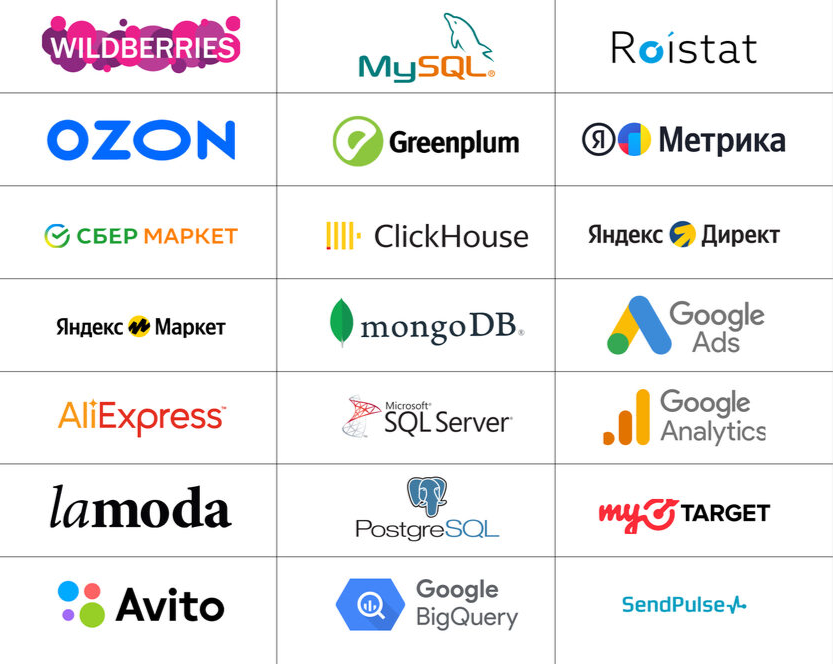 Интеграция данных из различных источников, включая 1С, CRM-системы, Google-сервисы, Excel-файлы, веб-сайты и другие